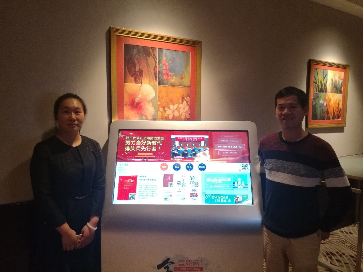 ↑圖為方正愛(ài)讀愛(ài)看產(chǎn)品負責人和他們的方正愛(ài)讀愛(ài)看觸摸屏