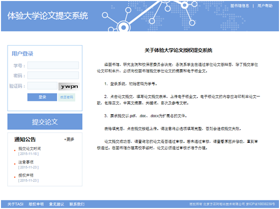 3、 授權模塊:取消了后臺的授權功能模塊,提前至學(xué)生提交論文環(huán)節。當學(xué)生第一次填寫(xiě)論文信息時(shí),系統會(huì )詢(xún)問(wèn)學(xué)生是否將論文授權給學(xué)校保留及使用等相關(guān)權限。